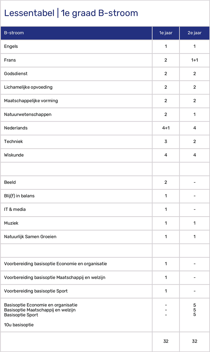 In de eerste graad leg je een brede basis en ontdek je welk traject het best bij jou past. Je krijgt les op een manier die aansluit bij jouw tempo, talenten en toekomstplannen. In de B-stroom ligt de nadruk op praktijk, met extra oefenkansen en leren door te doen. Via verschillende vakken en voorbereiding op de basisopties kan je jouw sterktes en interesses ontdekken. In de B-stroom bieden wij jou dus de extra ruimte om al doende te leren en stapsgewijs door te groeien naar de tweede graad.